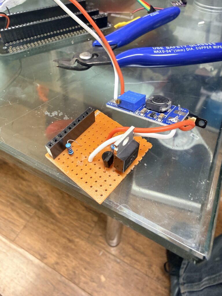 I have installed an N type MOSFET connected to GPIO19 that I’m hoping to use to switch on the low-side of the step-up DC-DC converter that generates the 13V DC we need for the wind speed and direction sensors. For some reason the output is only ever about 1-3V DC which is no use whatsoever. I thought the step-up might have gone faulty so I’ve tried another one with the same result. Again I ran out of time at 0430am so had to give up for the time being. I might try using a transistor to switch the MOSFET and see if that helps lower the resistance on it or worst case scenario I might have to try using a physical relay to cleanly switch the step-up on with no resistance in order to get the voltage we need 😩😮💨